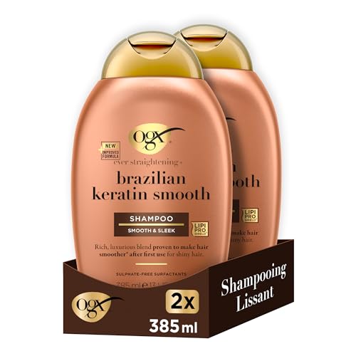 OGX | Shampoing Brazilian Keratin Therapy (lot de 2 flacons de 385 ml) – Shampooing lissant à la kératine – Soin capillaire sans parabène et sans tensioactifs sulfatés