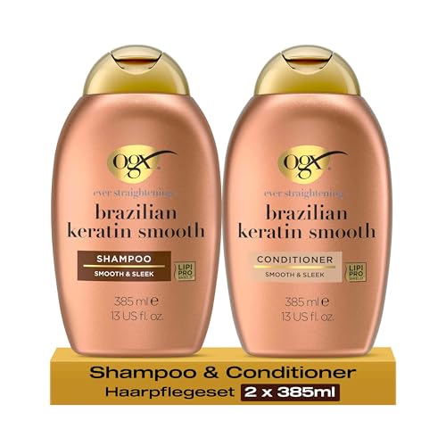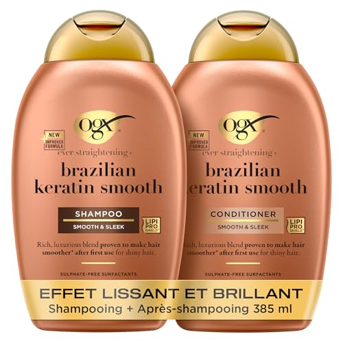 OGX Shampooing + Après-Shampooing Brazilian Keratin Smooth Effet Lissant et Brillant (lot de 2 flacons de 385 ml) - Après-shampoing fortifiant pour des cheveux doux et brillants