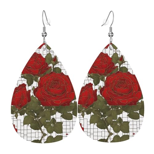 Boucles d'oreilles en cuir pour femme avec de belles roses rouges imprimées pour un usage quotidien, les fêtes, les rendez-vous et autres occasions