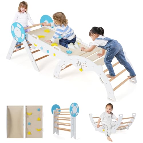 FANTASK Lot de 3 Triangles d'escalade 7 en 1 avec Toboggan, Arche d'escalade, avec Rampe Double Face et kit de Briques de Construction, Triangle d'escalade en Bois pour Enfants à partir de 1 an