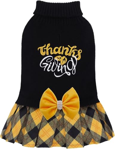 CuteBone Robe pull de Thanksgiving pour petites chiennes - Broderie de Thanksgiving - Col tortue - Pull de taille moyenne avec nœud papillon - Vêtement pour animaux de compagnie - Pour Chihuahua