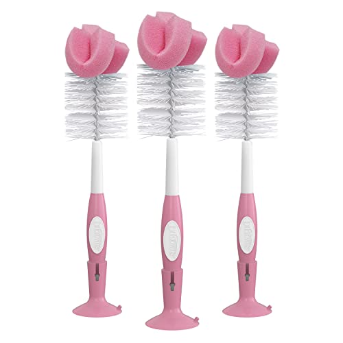 Dr. Brown's Lot de 3 éponges de Nettoyage réutilisables pour bébé avec Support à Ventouse, Brosse à récurer et Nettoyeur de tétons, Brosse à biberon Rose, Lot de 3