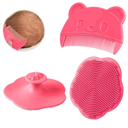 Aolso Brosse à cheveux pour bébé, 3 pièce brosse de massage, silicone pour le traitement des croûtes de lait Brosse, brosse pour bébé à poils souples, pour enfant et nouveau-né (Rose)