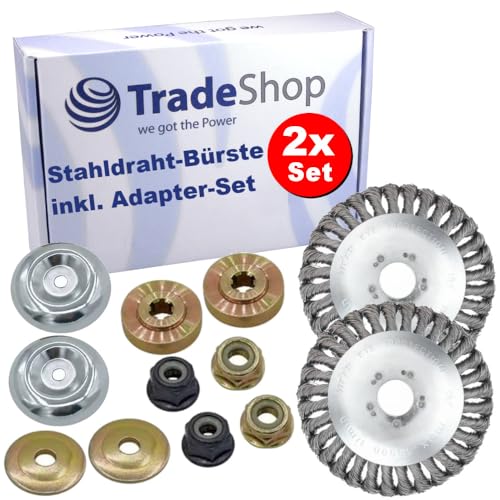Trade-Shop Lot de 2 brosses à mauvaises herbes en fil d'acier avec kit d'adaptateurs compatibles Stihl, Worx, Black & Decker, Husqvarna débroussailleuse