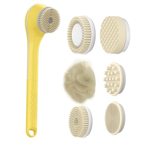 Fockety Brosse Corporelle électrique, Laveur de Dos Rechargeable pour Douche, Ajustable Brosse de Bain électrique pour Le Corps Imperméable Amovible Brosse Arrière Longue Poignée avec 5