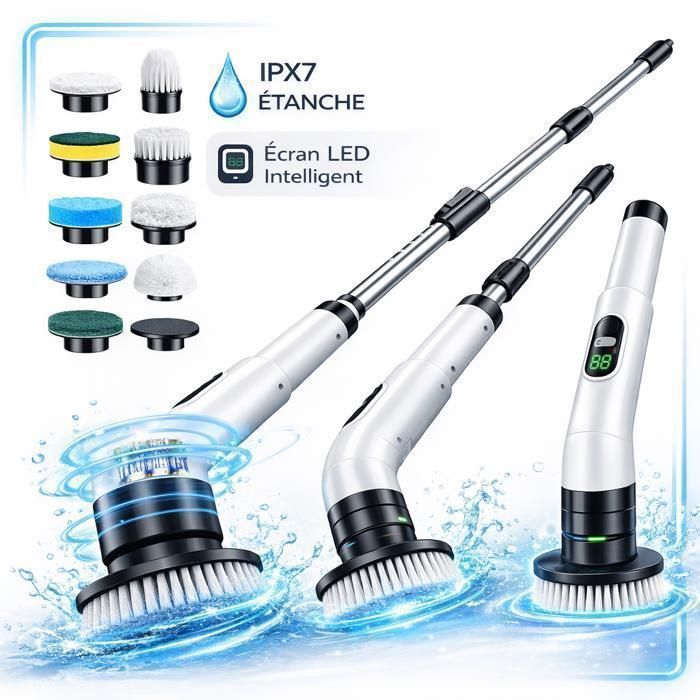 Brosse Nettoyage Electrique 9 en 1 Sans Fil Écran LCD Manche Télescopique Réglable Étanche IPX7 pour Salle de Bain Sol Maison