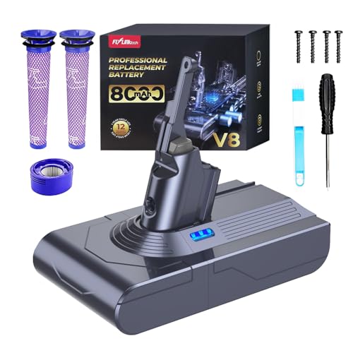 FLYLINKTECH Batterie Dyson V8 8000mAh – Batterie de Rechange Haute Capacité Compatible avec V8 Absolute, Animal, Fluffy, SV10 – avec 3 Filtres + Brosse de Nettoyage + Tournevis