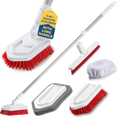 Brosse de Nettoyage de Douche avec Long Manche, Brosse à récurer 3 en 1 pour Baignoire et carrelage avec Long Manche Extensible de 127 cm, Brosse à récurer à Poils rigides Amovibles pour Le Nettoyage