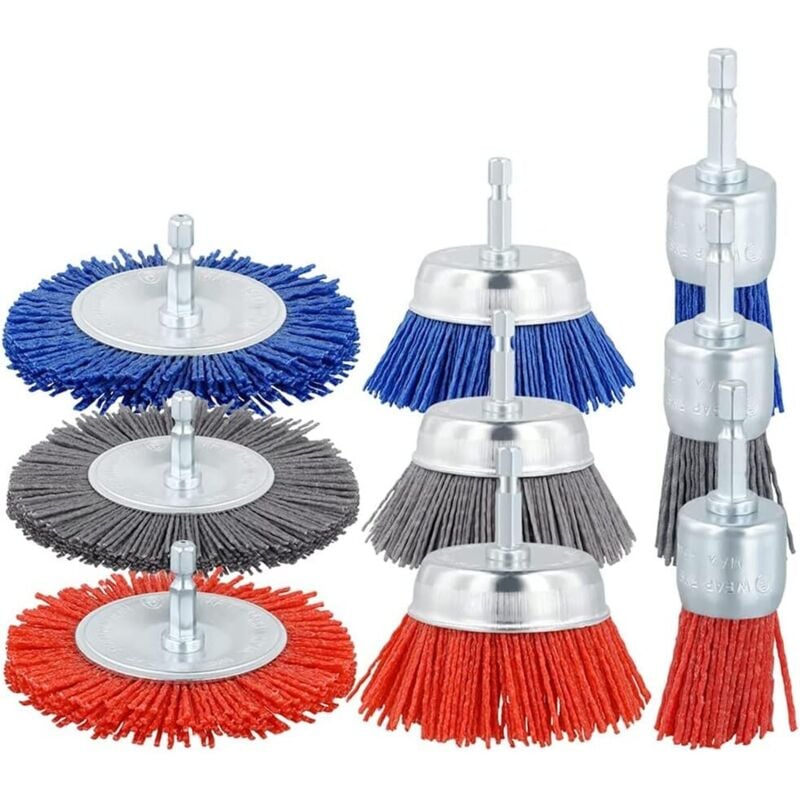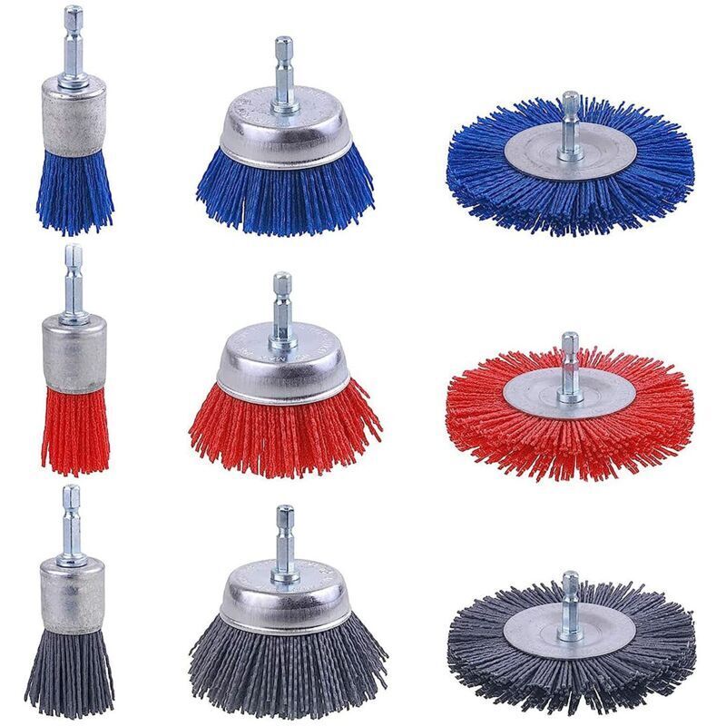 Lot de 9 Brosses Abrasives en Fil de Nylon, Brosse Nylon Perceuse avec Tige Hexagonale 1/4 Pouce, Outils Abrasifs Poncage Bois, Brosse Perceuse pour