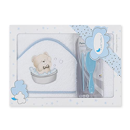 Interbaby Serviette à Capuche pour bébé Osito BAÑERA en Blanc et Bleu avec Set de Brosse et Peigne - 900 g