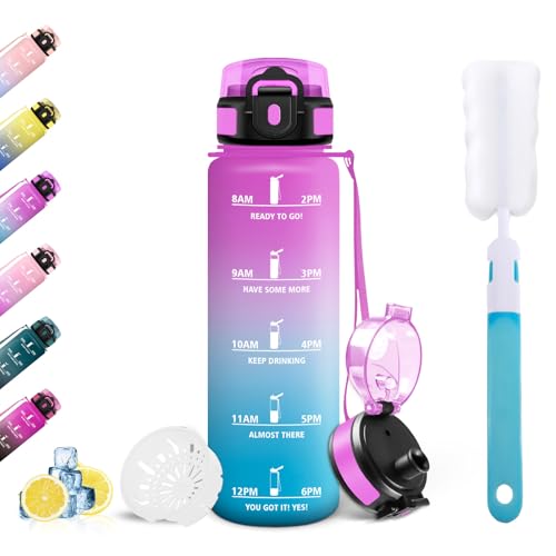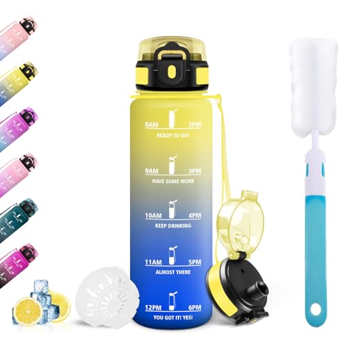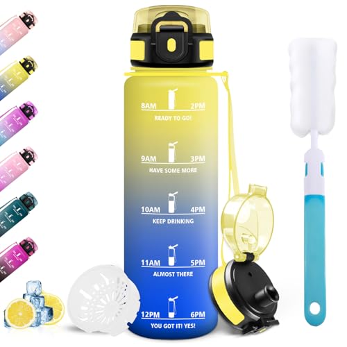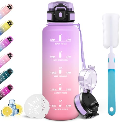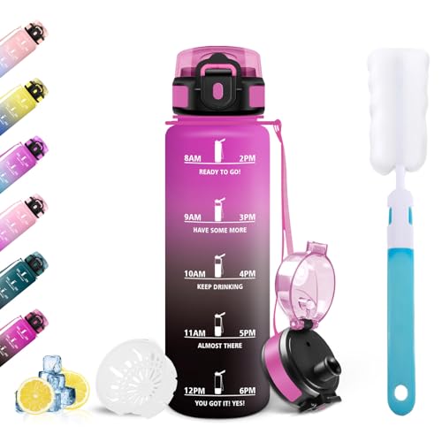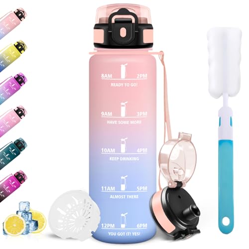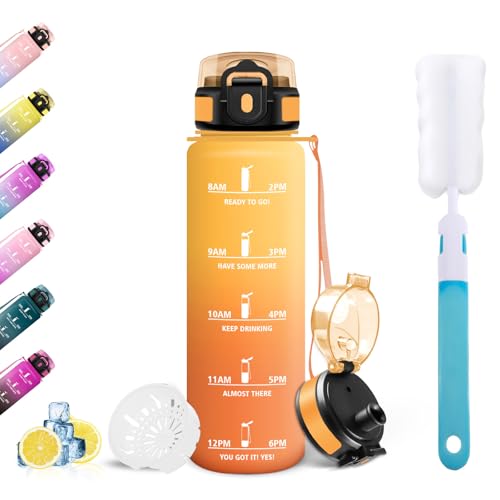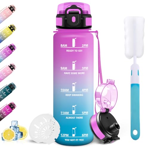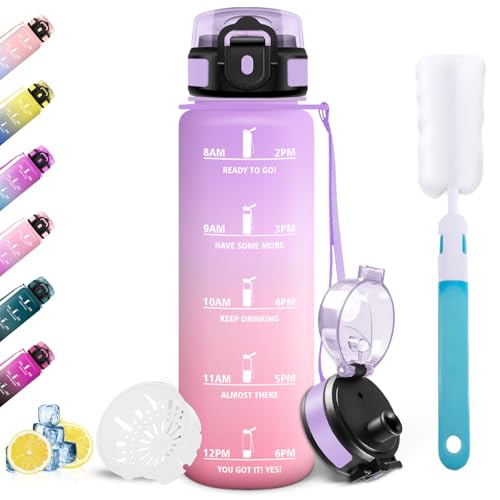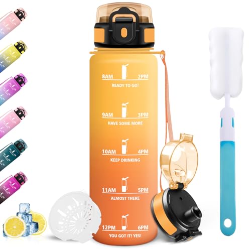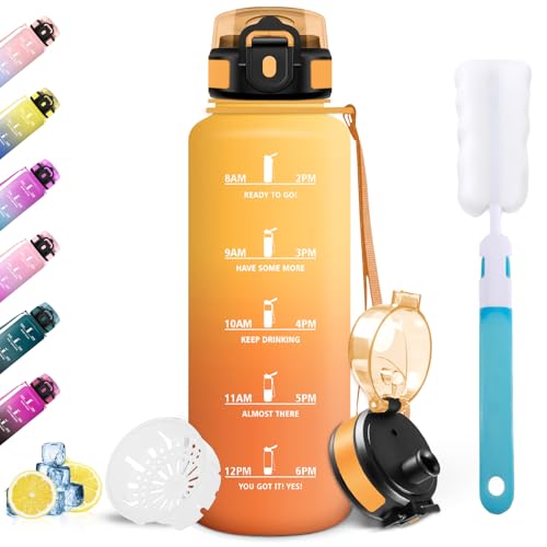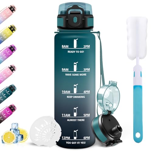 Mulbijeo Gourde 1L, Sans BPA, Gourde de Sport Étanche avec Repères Horaires, Brosse pour Bouteille, Réutilisable, pour Course, Gym, École, Bureau