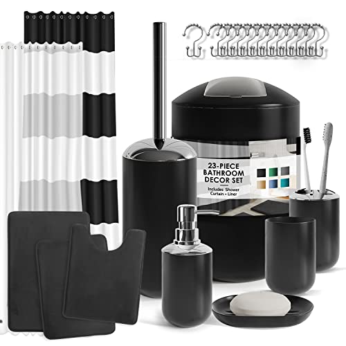 Clara Clark Ensemble d'accessoires de Salle de Bain, Rideau de Douche et Tapis, 23 pièces, Rideau de Douche avec Doublure, Distributeur de Savon, Porte-Savon, Porte-Brosse WC et Poubelle, Noir