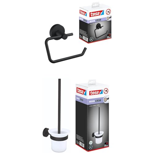 tesa Moon Black Set: Distributeur de Papier Toilette - Porte-Rouleau sans Couvercle pour Salle de Bain et Garniture de WC - Set avec Support & Brosse WC, Noir Mat- sans perçage