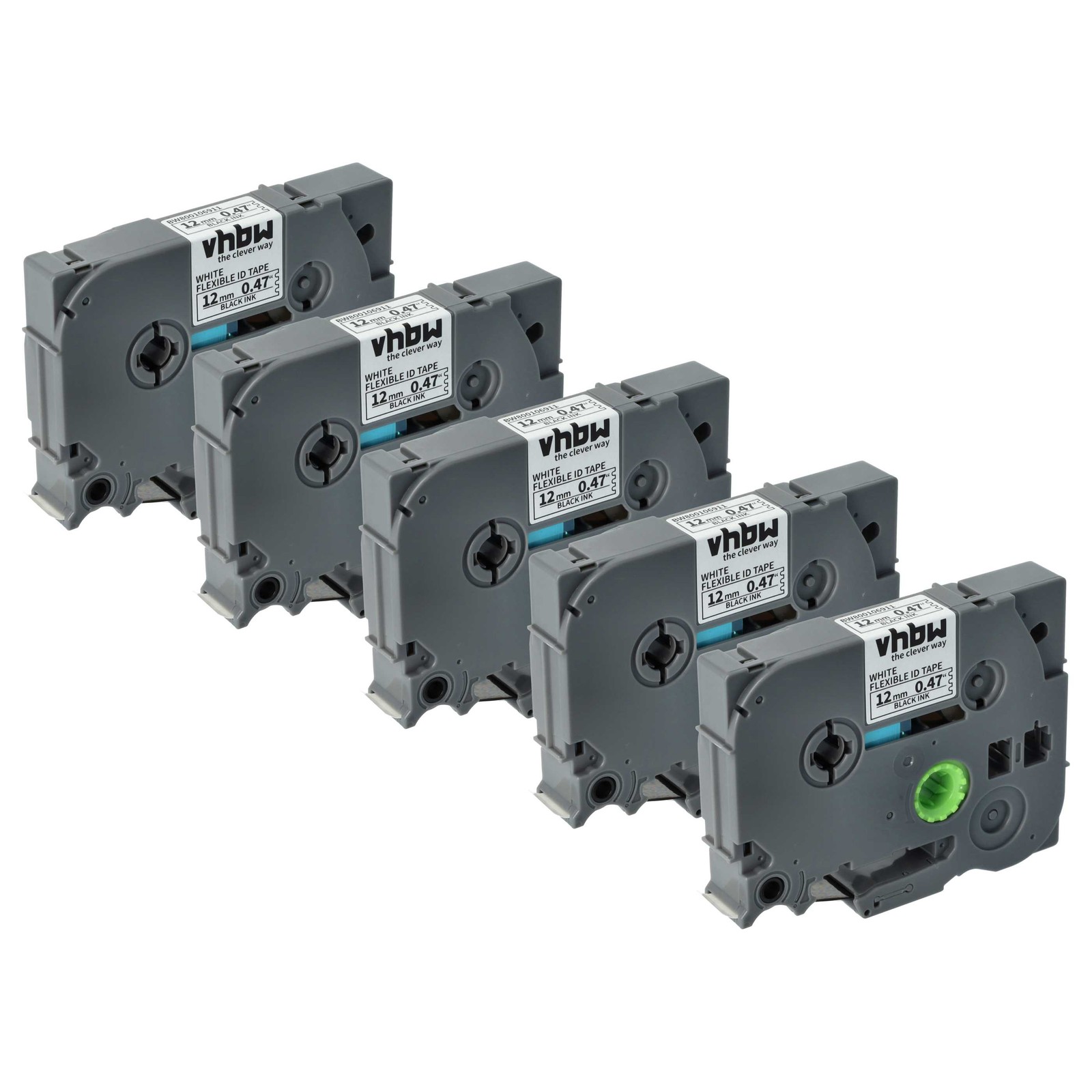 vhbw 5x Rubans compatible avec Brother PT E110, E100B, E115, E105, E100, E100VP imprimante d'étiquettes 8m x 12mm Noir sur Blanc, flexible
