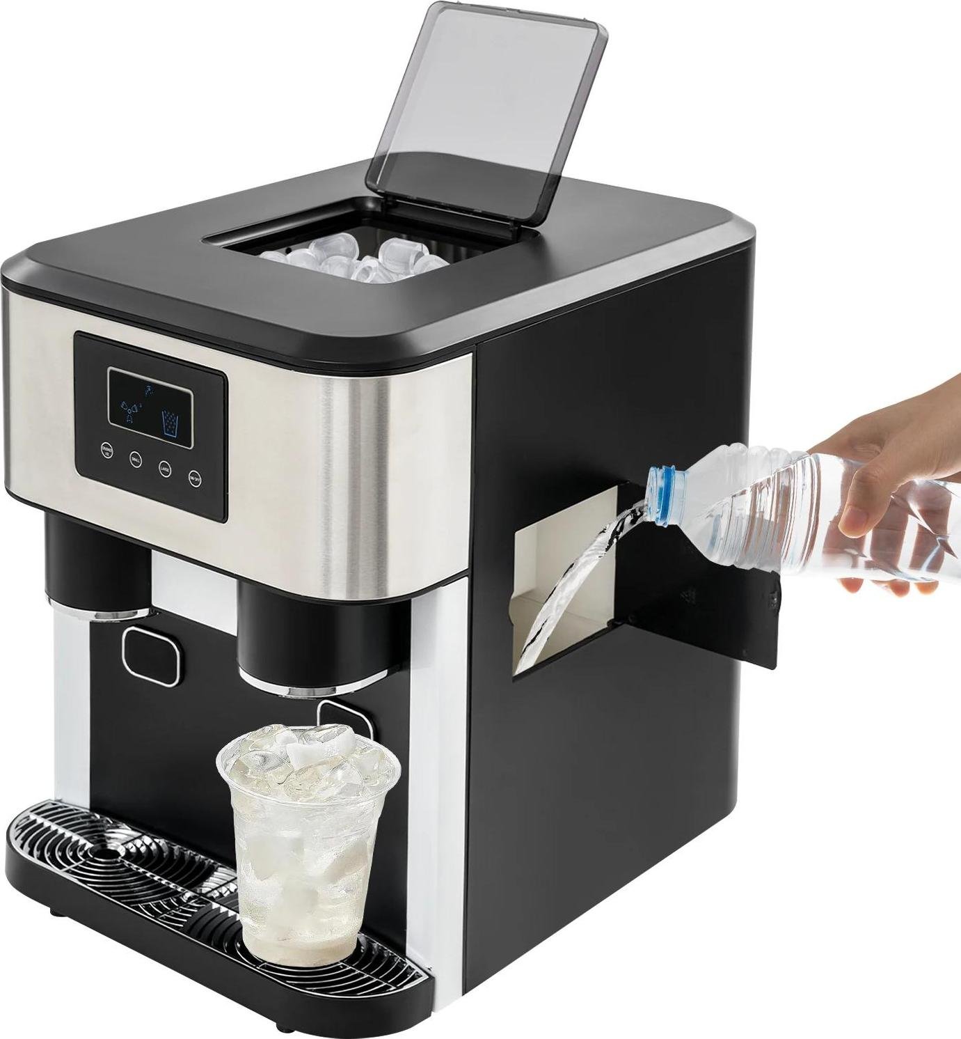 Machine à glaçons et distributeur d'eau 3 en 1 - Appareil de table - Broyeur à glace et eau froide - Écran LCD - Remplissage manuel/raccordement par tuyau - Prise UE 220-240 V - Noir