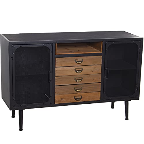 DRW Buffet avec 2 Portes Grille et 5 tiroirs en métal et Bois MDF Noir et Naturel 124x40x70cm