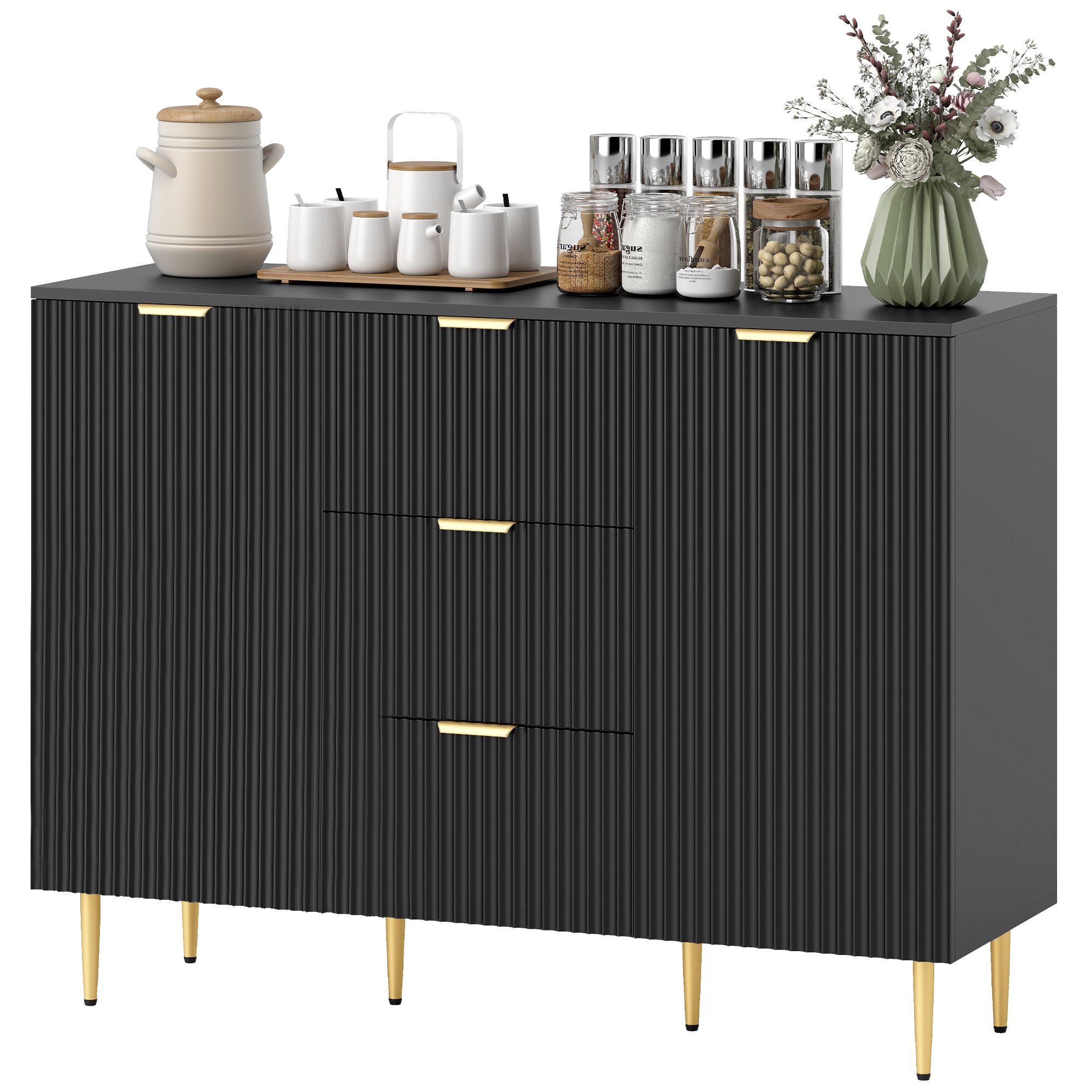 HOMCOM Buffet meuble cuisine rangement avec 3 tiroirs, étagères réglables, placards à portes cannelées, 120 x 40 x 90 cm, noir