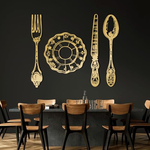 Ensemble de 4 pièces (Couteau, cuillère, Fourchette, Assiette) en métal, Sculpture de Buffet Vintage, décoration Murale pour Cuisine, Restaurant, Salle à Manger, Bistro (doré, 150 x 52 cm)