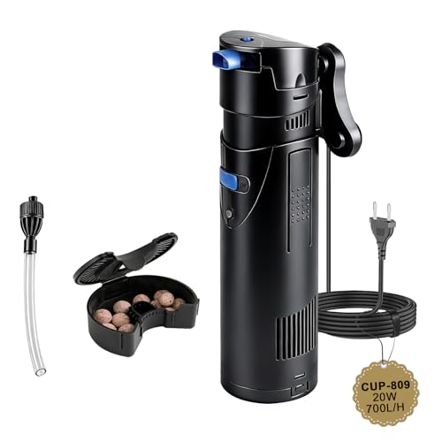EXLECO Filtre Pompe Aquarium 4 en 1 avec Lampe UVC 7W, Bulleur Silencieux 700 L/h 18W, Anti Algues, Pompe a Air avec Écumeur, Éponge et Média, pour Bacs 150-300L, Aquariums Complets et Eau Douce