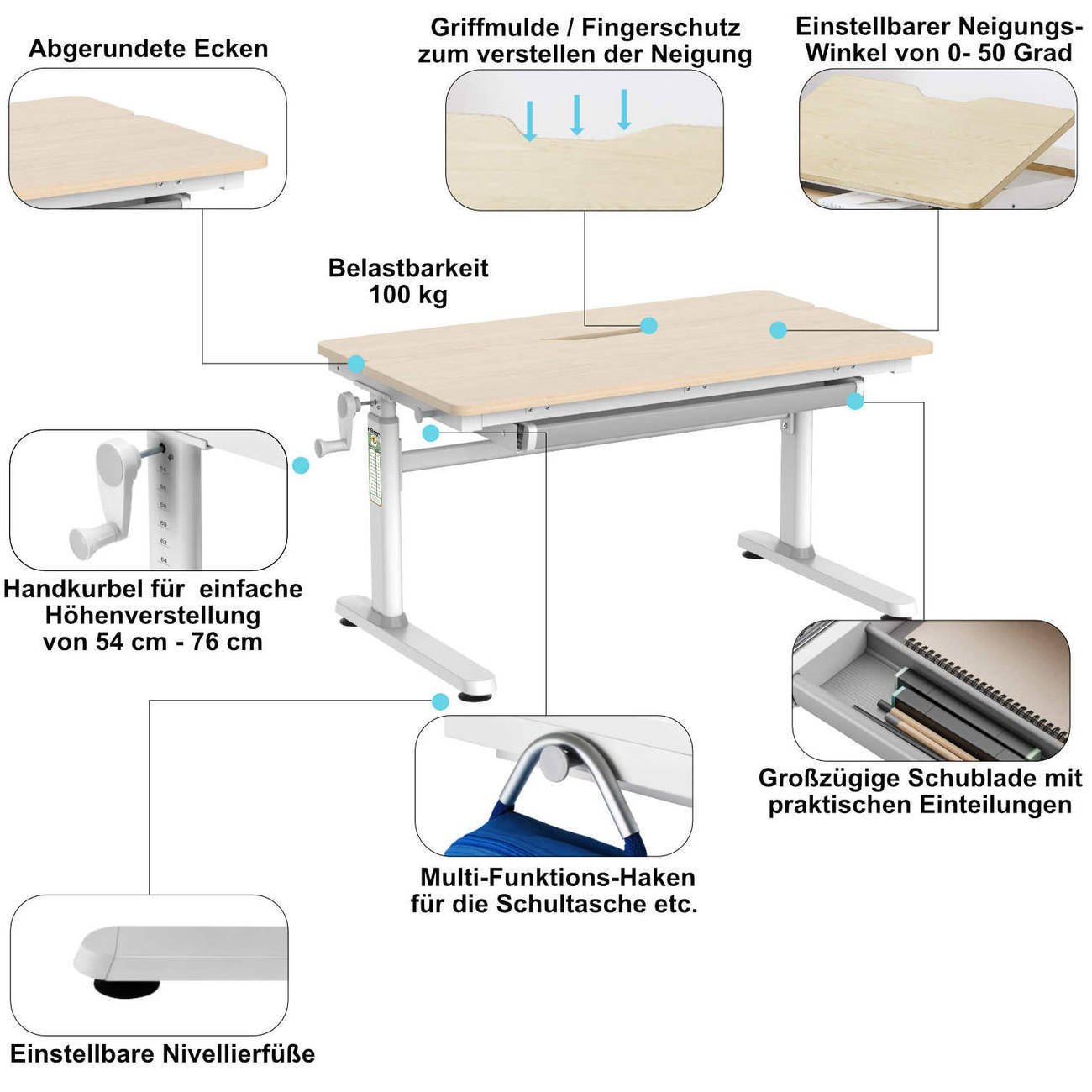 HOKO Bureau pour enfants 100x60 cm réglable en hauteur 54-76 cm avec tiroir & inclinaisonjusqu'à 100 kg