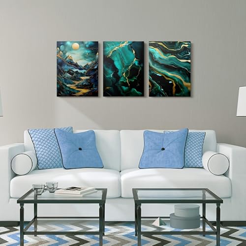 PEWFBS Ensemble de 3 toiles abstraites effet marbre vert émeraude et doré - Décoration murale moderne pour salon, chambre, bureau (75 x 110 cm x 3 / Sans cadre)
