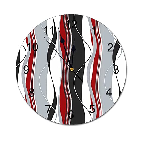 Horloge murale ronde moderne à rayures verticales rouges, noires, blanches et grises silencieuses sans tic-tac pour cuisine, bureau, horloge rétro à suspendre, 25,4 cm