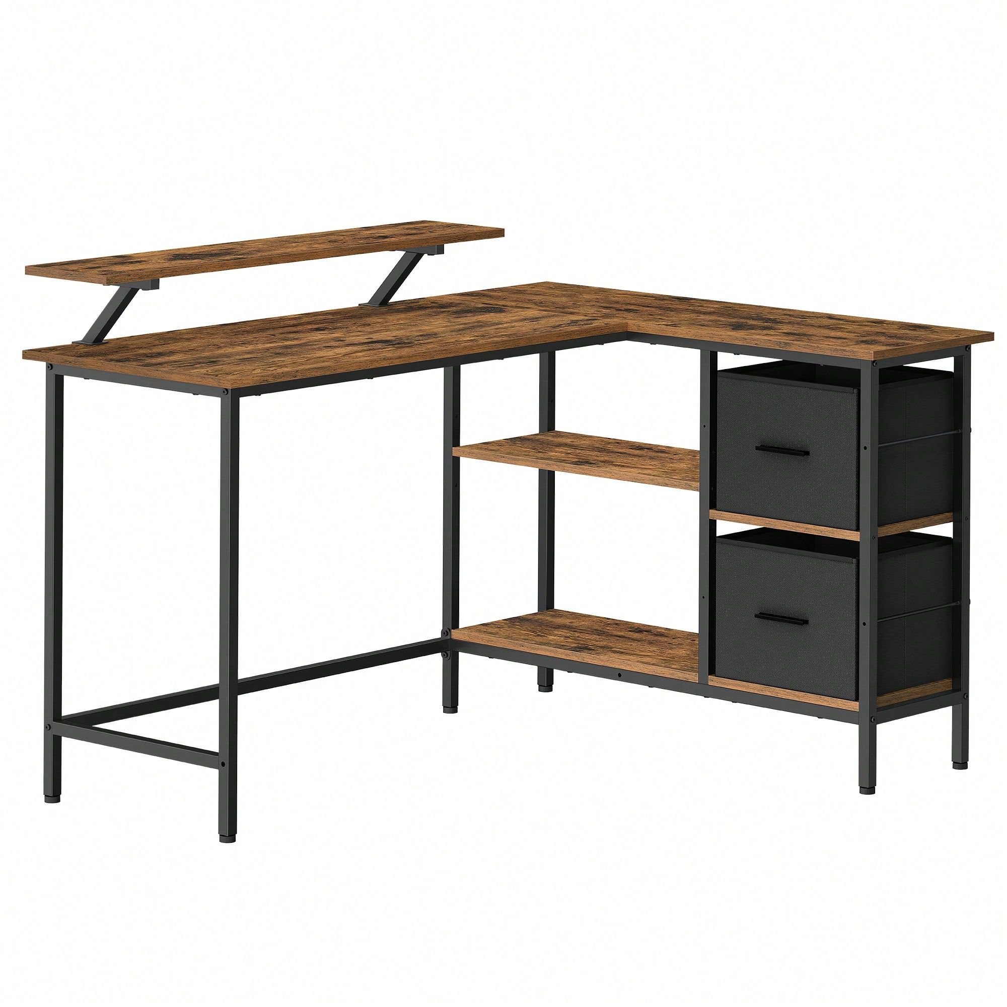 Bureau en forme de l avec 2 Tiroirs Spacieux, Bureau Gaming avec support pour Écran, Bureau d'angle, Étagère Réglable, pour bureau, Marron Rustique