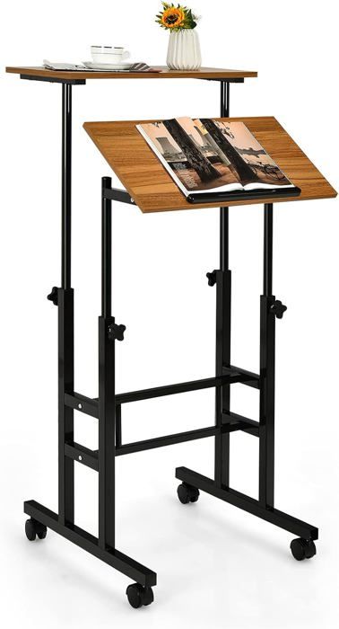RELAX4LIFE Bureau dOrdinateur Réglable en Hauteur et Angle Bureau Assis-Debout 2 Plateaux Table dappoint Noyer avec Roues