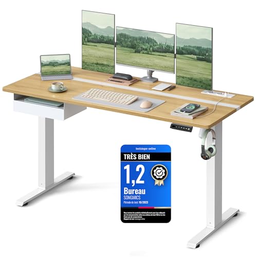 VASAGLE Bureau Électrique Réglable en Hauteur, Bureau Assis-debout, Multiprise, Tiroir, 60 x 140 cm, Réglable en Continu, Fonction Mémoire de 4 Hauteurs, Couleur Chêne Naturel et Blanc Nuage LSD114N01