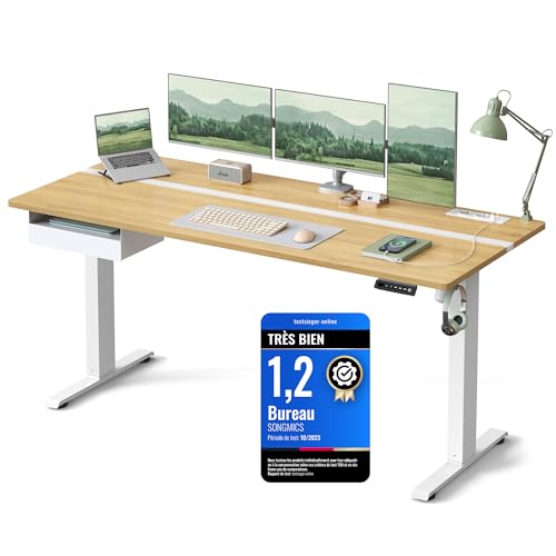 VASAGLE Bureau Électrique Réglable en Hauteur, Bureau Assis-debout, Multiprise, Tiroir, 70 x 160 cm, Réglable en Continu, Fonction Mémoire de 4 Hauteurs, Blanc Nuage et Couleur Chêne Naturel LSD116W01