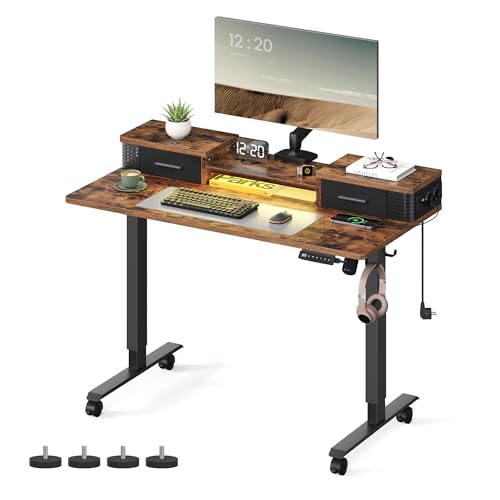 OffiGo Bureau Assis Debout Angle, 160x80cm Bureau Electrique avec 4 Tiroirs, Grand Table d'angle avec Prise, Standing Desk Réglable en Hauteur avec Rangement pour la Maison, Brun Rustique