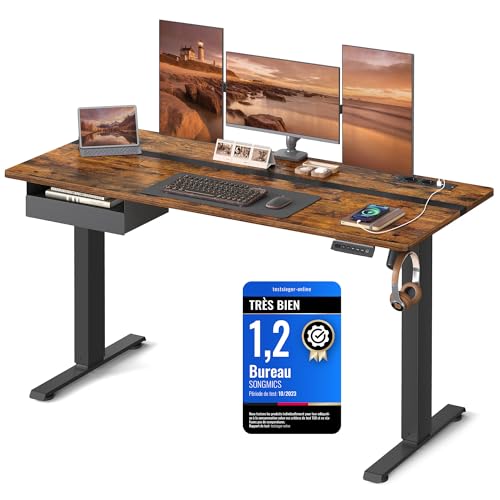 VASAGLE Bureau Électrique Réglable en Hauteur, Bureau Assis-Debout, Multiprise, Tiroir, 70 x 160 cm, Réglable en Continu, Fonction Mémoire de 4 Hauteurs, Marron Rustique et Noir d'encre LSD116X01