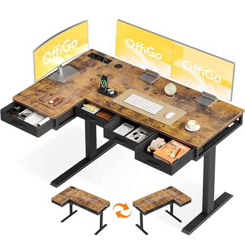 OffiGo Bureau Assis Debout Angle, 140x80cm Bureau Electrique avec 4 Tiroirs, Grand Table d'angle avec Prise, Standing Desk Réglable en Hauteur avec Rangement pour la Maison, Brun Rustique