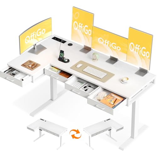 OffiGo Bureau Assis Debout Angle, 160x80cm Bureau Electrique avec 4 Tiroirs, Grand Table d'angle avec Prise, Standing Desk Réglable en Hauteur avec Rangement pour la Maison, Blanc