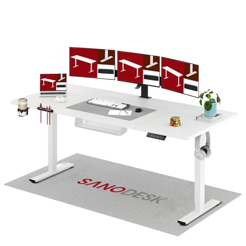 SANODESK Bureau Assis Debout Électrique 160x60 cm Bureau Debout Réglable en Hauteur, Panneau Clavier Contrôle à Fonctions Mémoires avec Crochet, Blanc