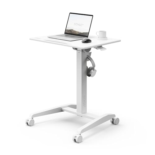 SENSE7 Bureau réglable Mobile Desk avec 4 roulettes, 70x52 cm, Bureau Assis-Debout Pliable, Plateau inclinable, Table Mobile pour Ordinateur Portable avec Crochet, Poste de Travail Ergonomique, White
