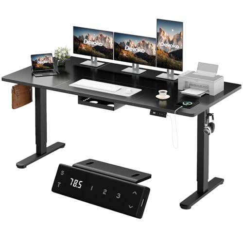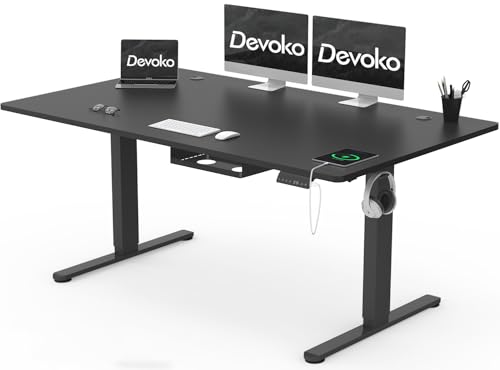 Devoko Bureau Assis Debout Électrique 160×80cm, Bureau Électrique avec Chargeur Type-C, Organiseur de Câbles et 3 Positions Mémorisables, Bureau Réglable en Hauteur(160×80cm,Noir)