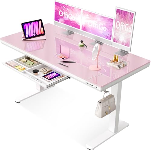OffiGo Bureau Assis Debout Électrique, 140x60cm Plateau en Verre, Réglable en Hauteur, Tiroir Intégré, Ports de Charge USB et Type-C, Idéal pour Bureau à Domicile ou Büro, Rose