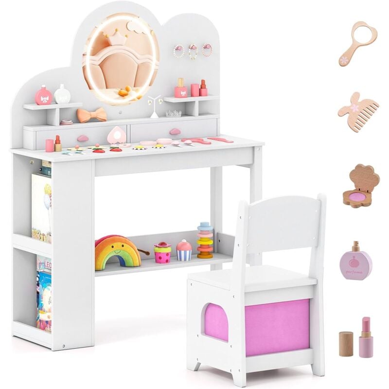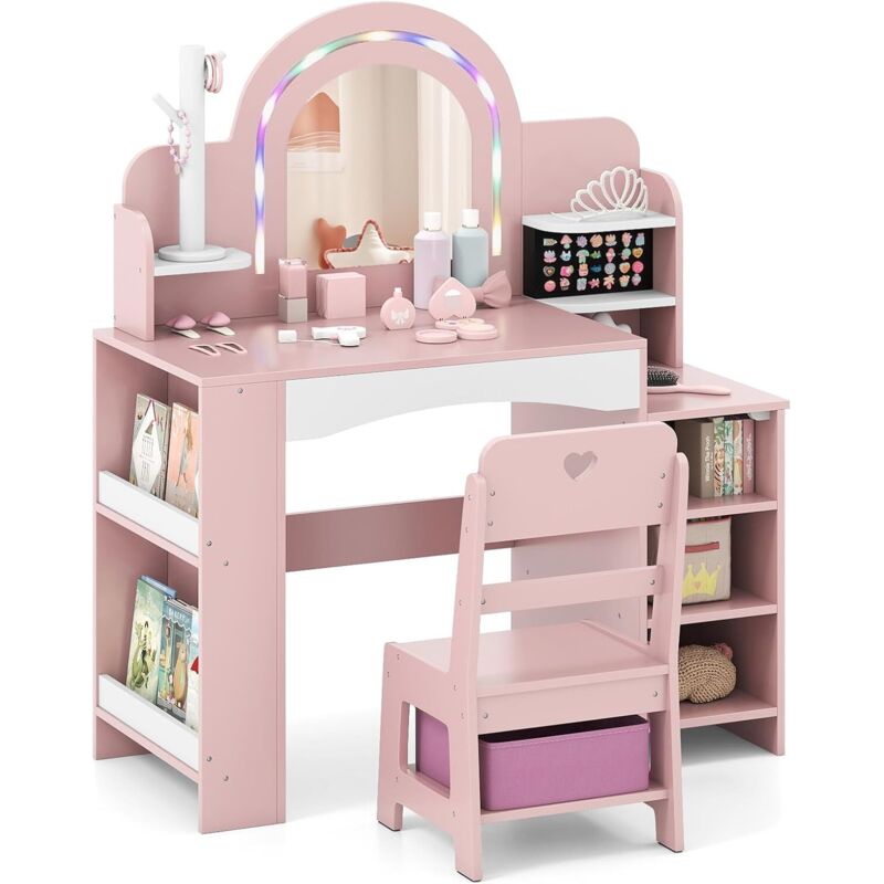 COSTWAY Coiffeuse Enfants Fille avec Chaise & Miroir Éclairé, Bureau Enfant Fille avec Bibliothèque & Étagères Ouvertes & Support pour Bijoux,