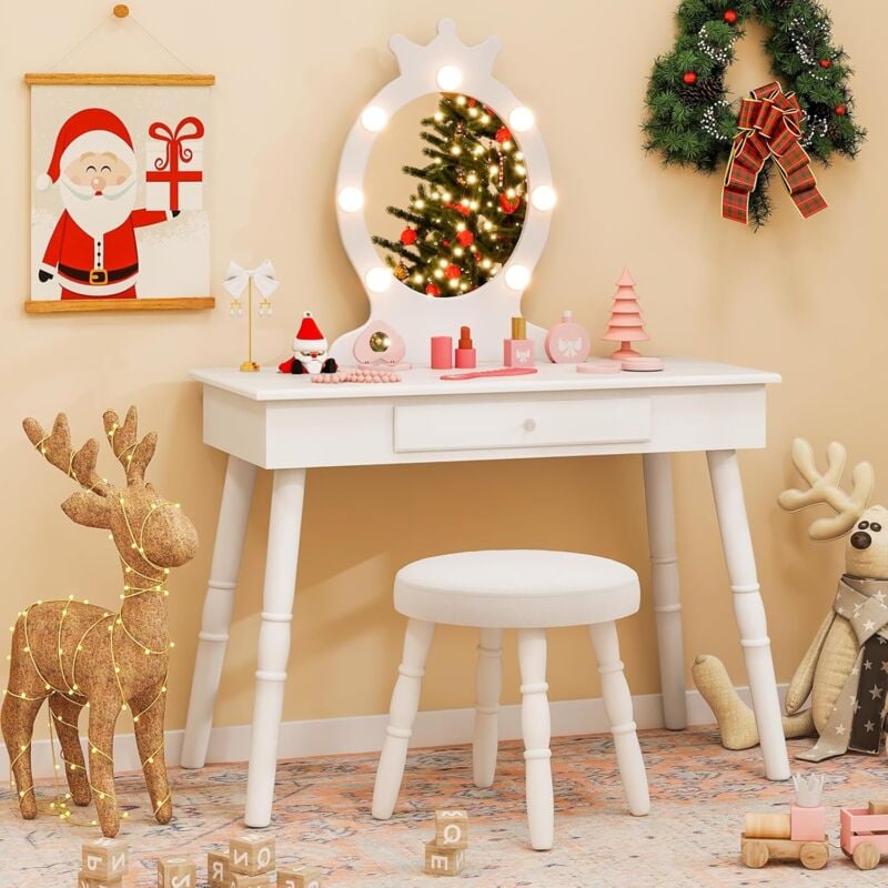 Costway coiffeuse enfant fille avec chaise & miroir éclairé led, bureau enfant fille avec étagère & tiroirs & crochets, dispositif anti-basculement, charge 5075kg pour enfant de 3 ans+, blanc