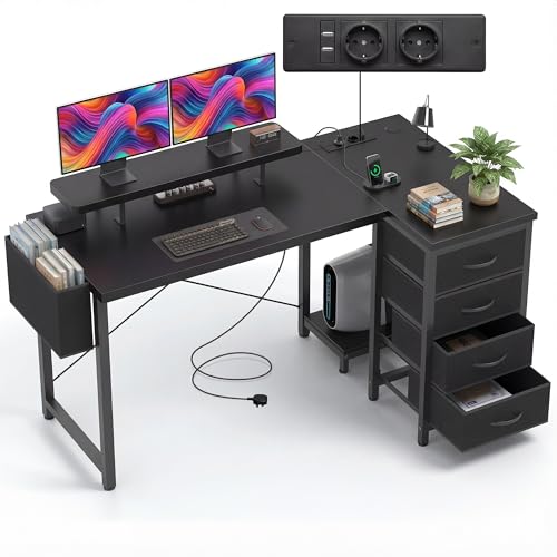 Claiks Bureau d'angle avec 4 Tiroirs,140x80x75 cm Bureau en L avec Prises de Courant et Ports de Charge USB, Table avec Support d'écran und Poche de Rangement latérale pour dans Un Grand Bureau, Noir