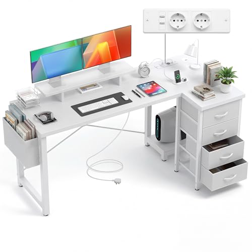 Claiks Bureau d'angle avec 4 Tiroirs,140x80x75 cm Bureau en L avec Prises de Courant et Ports de Charge USB, Table avec Support d'écran und Poche de rangement latérale pour Dans un Grand Bureau, Blanc