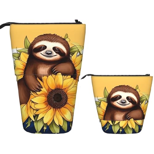 Trousse à crayons télescopique motif paresseux assis sur un tournesol debout - Trousse à crayons - Jolie trousse de maquillage portable pour femme et homme - Fournitures de bureau