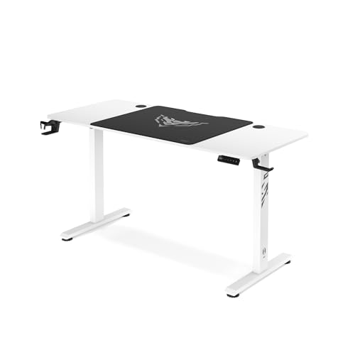 OffiGo Bureau Gaming, 140cm Bureau Assis Debout avec LED RGB et Prises, Standing Desk Electrique avec 3 Rangement Ouverts, Porte Gobelet et Porte Casque, Fibre de Carbone, Blanc