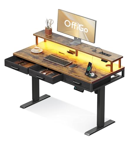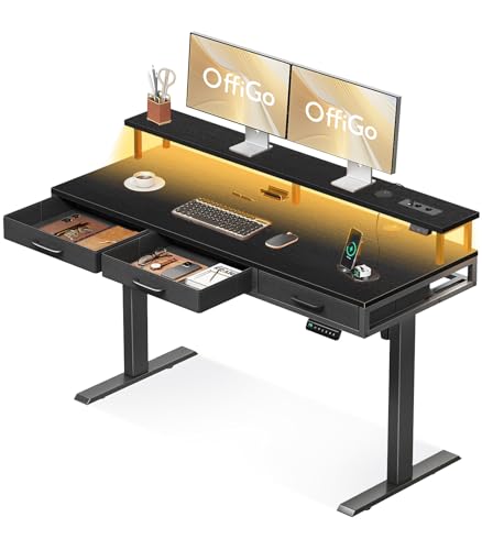 OffiGo Bureau Assis Debout avec 3 Tiroirs, 140cm Bureau Electrique avec Support de Moniteur, Standing Desk avec Chargeur et Lumière LED, Table pour Le Travail, Noir