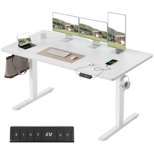 FEZIBO Bureau Électrique Réglable en Hauteur avec Ports de Charge USB-A et USB-C, 140 x 70 cm, Bureau Assis Debout, Ergonomique pour Télétravail, Blanc