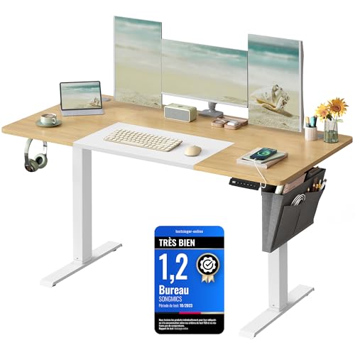 FEZIBO Bureau Électrique Réglable en Hauteur avec Ports de Charge USB-A et USB-C, 120 x 60 cm, Bureau Assis Debout, Ergonomique pour Télétravail, Planche Chêne Blanc