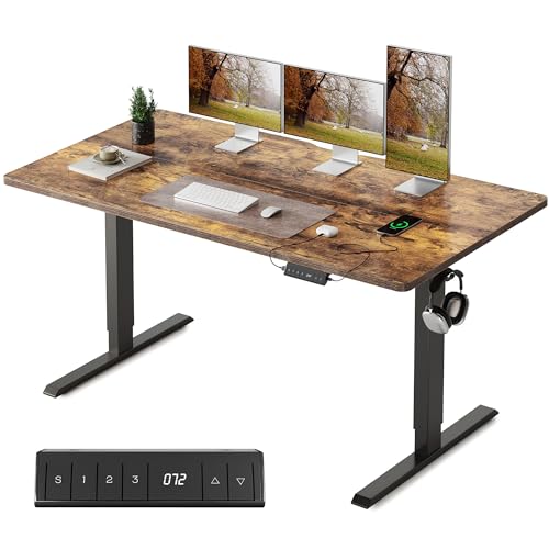 FEZIBO Bureau Électrique Réglable en Hauteur avec Ports de Charge USB-A et USB-C, 140 x 70 cm, Bureau Assis Debout, Ergonomique pour Télétravail, Marron
