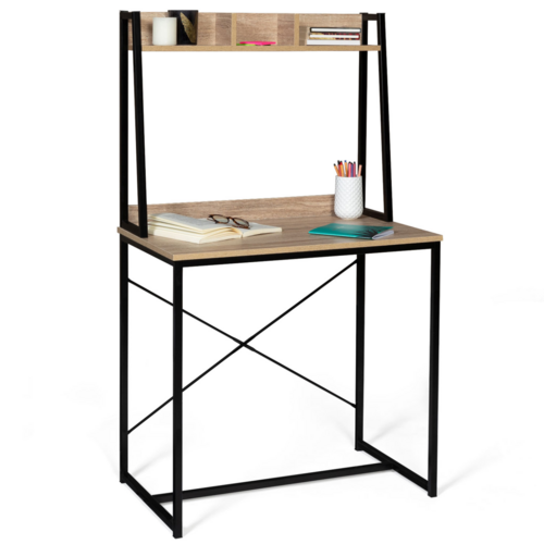 Bureau droit MAE 3 tiroirs avec étagères de rangement blanc et bois