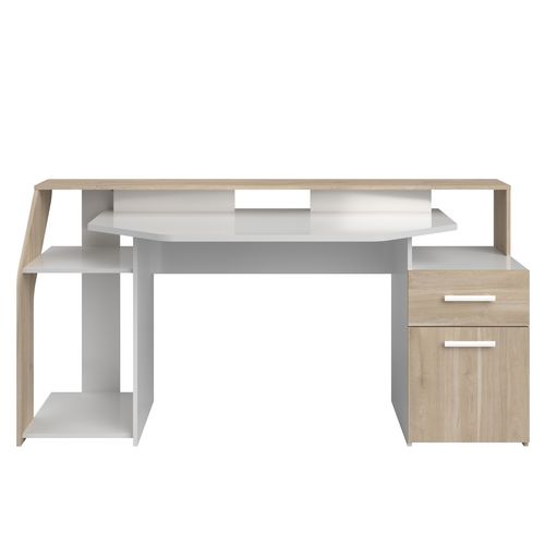 Bureau droit à clés avec 1 porte et 4 tiroirs - Décor chêne et blanc - 126 x P 55 x H 76 cm - ALICANTE